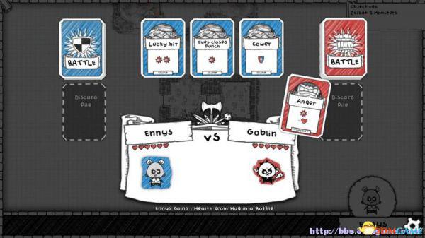 敌人外观(2):红色底色表示敌人。其头顶的红心代表其当前所拥有的HP值,当受到伤害时,心心数量就会减少,当失去所有红心时,代表敌人阵亡,此时玩家可以获得三张道具卡牌,任选其一作为奖励,击退敌人也可以获得金币奖励。
