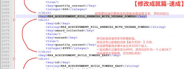 存档位置:【C:UsersxxxAppDataLocalKingdom Rush Vengeance】,右键存档文件slot_1.plist,以记事本方式打开即可查看你的所有游戏记录。可以随时修改成就的进度、通关的情况、英雄的经验值和等级等等。