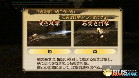 △——石き打击:和突击不同主要是用枪柄带动枪头横扫,威力比突き攻击稍强,可作三连击。它的攻击范围要比普攻大些,不过没突き攻击那么集中。