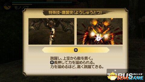 O——鹰袭突:长按O后松开可发动此技,最多可作四重蓄力。其攻击方式是跳跃后,从高空坠落贯穿敌人,攻击过程中总共有二连击,蓄力越久时间,发动后就会跳得越高且威力越强。另外,发动此技能时可以在空中位移,这样不仅能自由地选择攻击的对象,还能避开一些攻击。