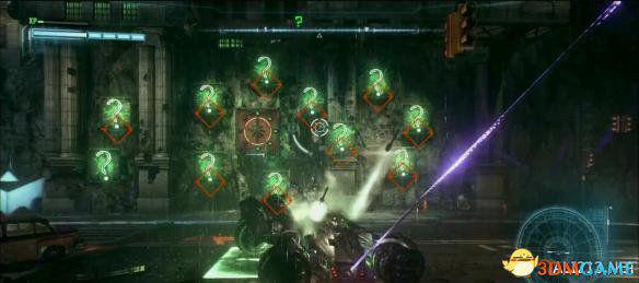首先正后方有个锚点用绞车勾住充电,再用蝙蝠车压住踏板。类似打地鼠,快速将所有亮起来的问号打掉(这时候只能用R2打)。最后会全亮,连续按方块导弹多重锁定,剩下的再一炮解决。