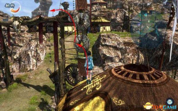 先找到那顶最大的帐篷,由石块跳到帐篷的顶部。