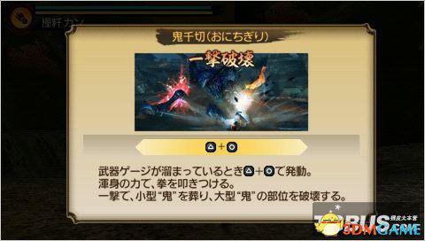 当画面的左上角图标闪亮后,玩家可以释放鬼千切,注意鬼千切的效果就是一击破坏敌人的部位。由于判定是自己身前,所以BOSS在没有躺下前不可以破高部位的躯体,需要先把BOSS的腿部或其他支撑身体的部位打断,让BOSS躺下了再进行断高身为的躯体。由于鬼千切的判定只有一次,所以一次只能打断一个部位。