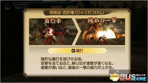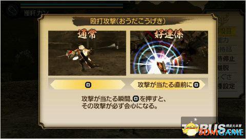 被动效果:好连携,在此被动效果下,攻击必定是会心一击,但是时间十分难掌握。要取得100%会心判定,大约是当手臂张开到最大的时候再按一次□键才会触发,并不推荐玩家花费大量的时间去摸索攻击要诀。其次每次的普通攻击都可以按△键从而进行连招,推荐连招下文会有所介绍。
