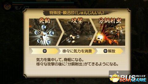 O——迅瞬印:发动后会持续消耗气力,不过在这个过程中作分铜射出的话再按口即可再次发动分铜射出,无需下地后再蓄力口发动分铜射出。此招如果配合△的空中三连击的话,那么在气力槽满足的情况下玩家可以无限制地对敌人进行空中连击。