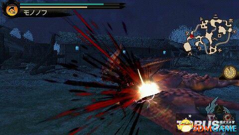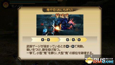 △+O——鬼千切:锁镰的必杀技,攻击方式有点像有绳子拉着的回力标。按口/△/O即可发动,如果不按的话,数秒内自动抛出回力标。此必杀的攻击范围中等,刚抛出去的时候如果没有命中的话,回力标的返程也有攻击判定,因此攻击判定只有一下。另外,鬼千切发动完毕后,会滞空一小段时间,如果这时玩家气力槽允许的话可以继续作空中连击。