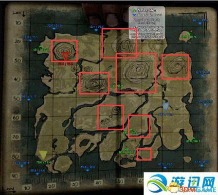 铁矿大致的分布图,富矿基本上集中在五座大山上,地图相对较小的方框是几座山坡,只不过比较小,这些地方少大型是肉龙,海边多前期食草龙,适合新手生存