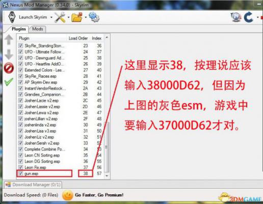 其中xx000D62的xx为你的NMM MOD管理器中gun这个esp的加载顺序,如果是左面一排从上往下第38个,那输入的代码还要看情况