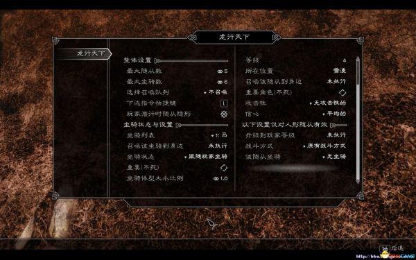 最大随从数:默认5,最大20。请根据自己电脑配置设定。按照老滚的高材质,平时带3到5个随从在身边差不多了。剩下数量的是留给等待的随从或自由活动的随从。当然如果大家觉得不够我以后可以再加。最大坐骑数:默认6,最大6。