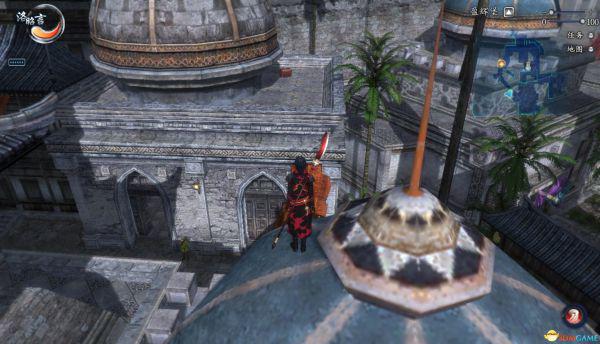 小地图上的位置,跳到房顶上可以看到对面的宝箱,这和宝箱1不是同一个,从连着2栋建筑的棕色布料形成的桥走过去,之后很多地点也需要从这种布上走。