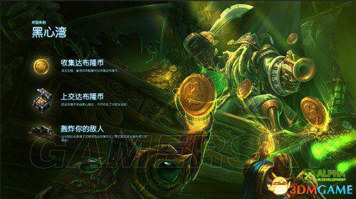 黑心湾的特色是可以收集达布隆币(以下简称金币)来交给地图中间的黑心湾船长,使他发动幽灵船来为我们攻击敌方的建筑。幽灵船对防御塔的输出非常恐怖,所以抢到幽灵船的一方在推塔数上将会有巨大的优势。