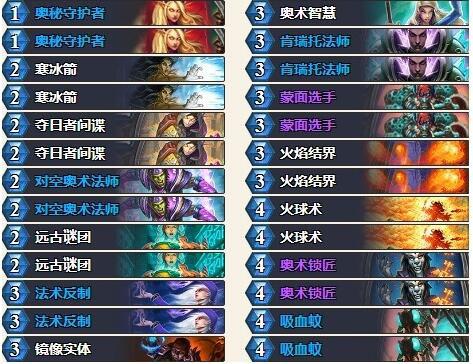 奥秘守护者和蒙面选手能进构筑的就是因为远古谜团这张卡,二费抽一张零费奥秘,当回合使用可以buff奥秘守护者,下回合出再上蒙面选手还能再拉一个奥秘,节奏感十足。奥术锁匠的加入主要是保证自己头上有奥秘,五费可以接云雾王子站场+打伤害。