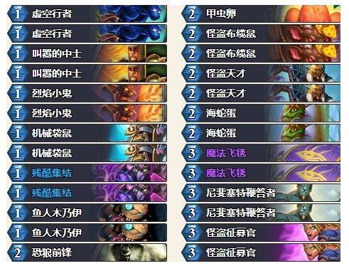 卡组思路与上版本类似,前期烈焰小鬼、蓝胖和机械袋鼠等小生物站场,靠恐狼或叫嚣在随从交换时破开海蛇蛋和甲虫卵,获得场面收益,中期靠跟班、兀鹫和飞毯等牌持续膨胀场面压死对手。