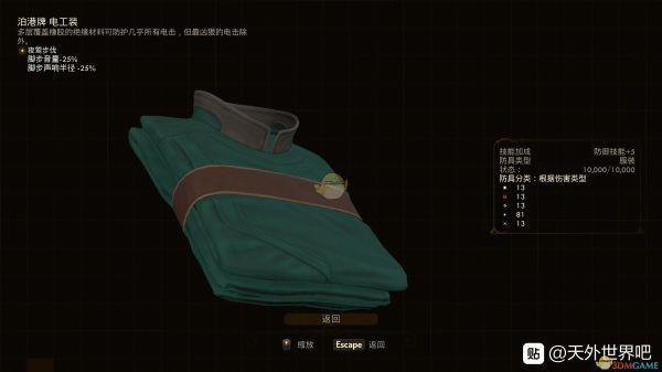 《天外世界》中DLC的防具电工装是非常好用的武器,很多玩家都不太清楚它的具体属性效果是什么,今天小编就给大家带来玩家“神秘的车头”分享的DLC防具电工装属性效果,希望能对大家有所帮助。