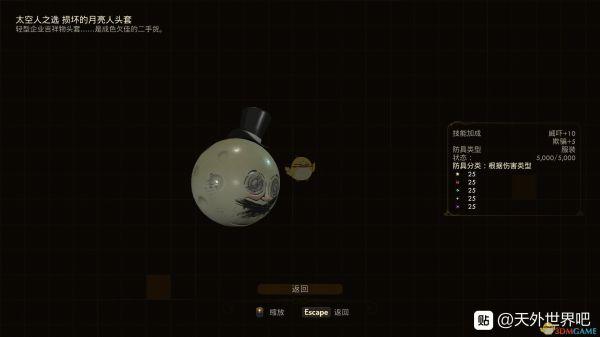 《天外世界》中DLC的防具损坏的月亮人头套是非常好看的,很多玩家都不太清楚它的具体属性效果是什么,今天小编就给大家带来玩家“神秘的车头”分享的DLC防具损坏的月亮人头套属性效果,一起来看看吧。