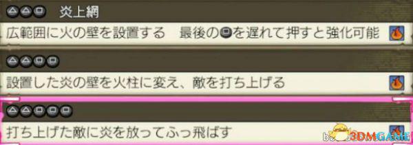 逆C3-1前方放出火焰结界,范围中等,蓄力后范围变大,逆C3-2放出火焰向上冲击,逆C3-3斜向上放出一个大火球,整套下来伤害还是比较大的,相比C1更推荐这一招,但是个人感觉这招相比C1会把敌人打的稍远一些。