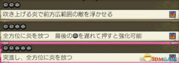 C3-1左手捶地前方大范围火焰,C3-2张开双手长距离向前冲击,C3-3跳起斜向下冲击地面大范围火焰攻击,清兵不错,蓄曝气槽比较快,威力也可以,最后的C3-3致晕率还不错,但由于这招移动性很大感觉对将的话没有其他招简单直接。