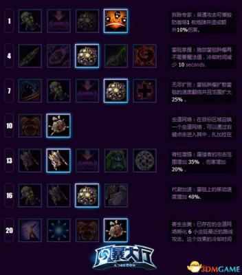 爆虫冲锋[ Q ]:消耗:50法力,冷却:10秒。目标:方向;范围:直接选择,直线。发射一系列接触敌人会爆炸的爆虫。对每个目标造成135(40+每级5)点溅射伤害。