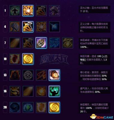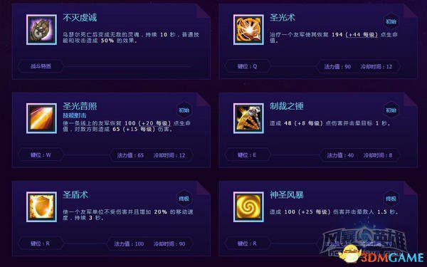 圣光普照(W):治疗和伤害效果都不错,非常依赖使用熟练度。治疗方面:平时人多的话可以用圣光普照团体治疗,圣光术留着省蓝或急用。伤害方面:骚扰敌人,打断敌人交金币、贡品。有时候可以用来辅助清兵。