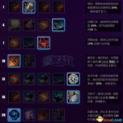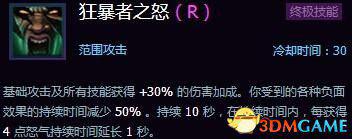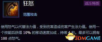 狂怒打击——W的伤害提高30%怒气消耗提高5点;超高的爆发力加成,懂得积攒怒气的话消耗也不是问题。