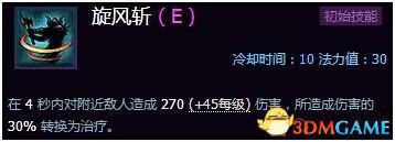 强力的回血技能,击中的单位越多,回血速度越快!加上特质的关系桑娅不用经常回家,没血了到兵线上转两圈就可以了。缺陷是旋风斩会被敌人的控制和击退技能打断。