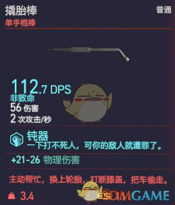 在《赛博朋克2077》中的近战武器有着很多的种类,其中的钝器可以击倒敌人而不杀死,其中有一把武器叫做“撬胎棒”,该武器的描述很有一种黑色幽默的味道,感兴趣的小伙伴可以通过这篇《赛博朋克2077》撬胎棒武器图鉴来了解一下。