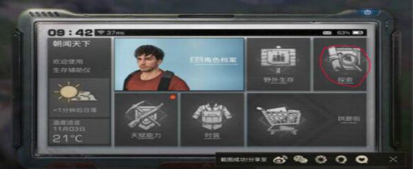 点左上角的生存辅助仪(那个类似房子的标志),然后右上角有探索,进去后会扫描地图,然后最下面有每天的线索提示,成功破译后可以开启一个探索宝箱。