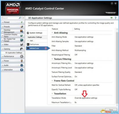 开启AMD显卡控制中心=>3D应用程序设定=>帮巫师3建立一个档案=>修改我红色圈选地方