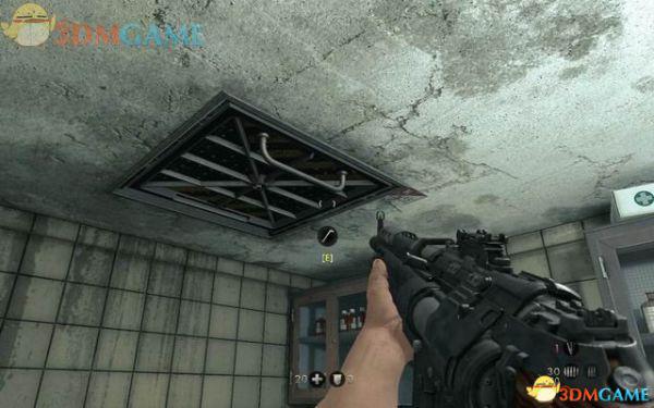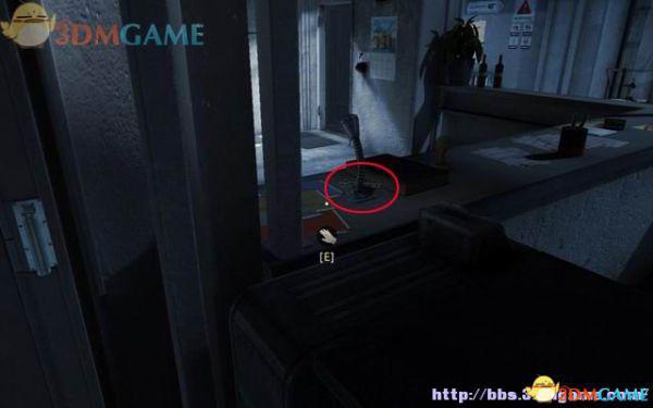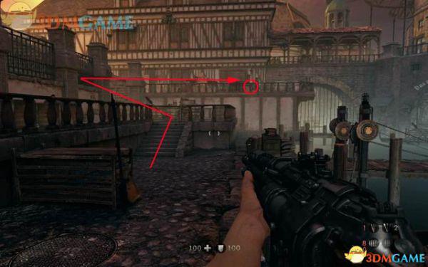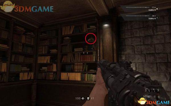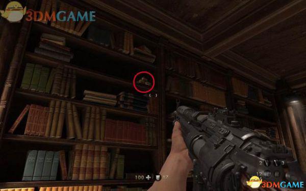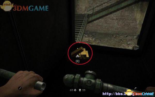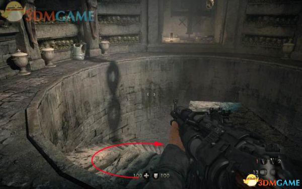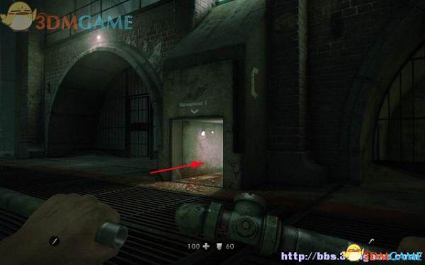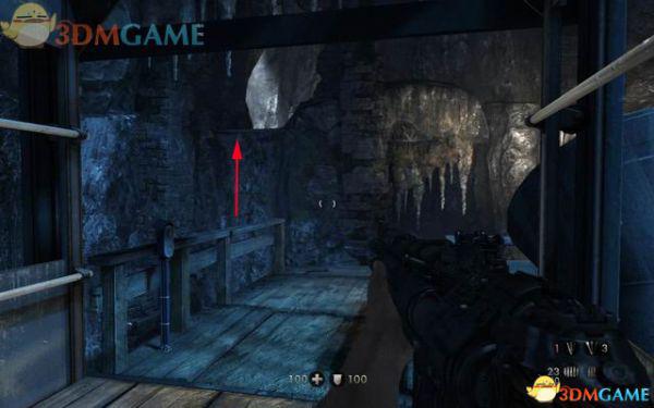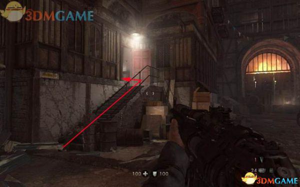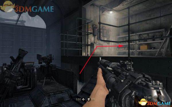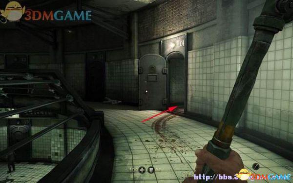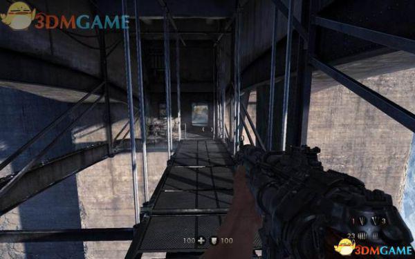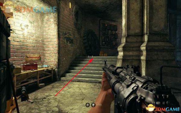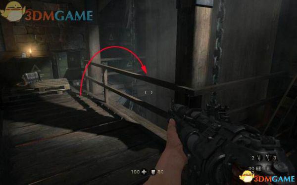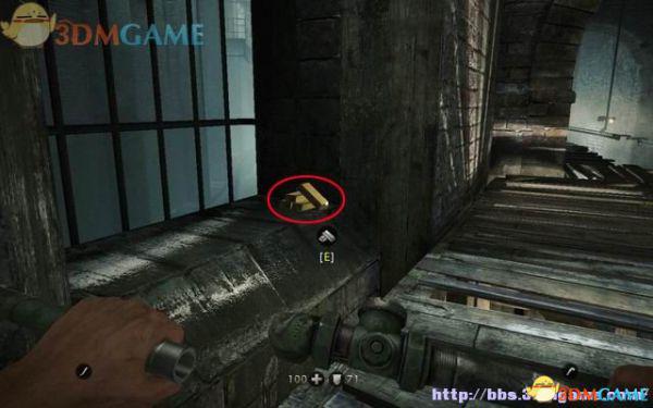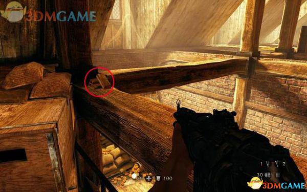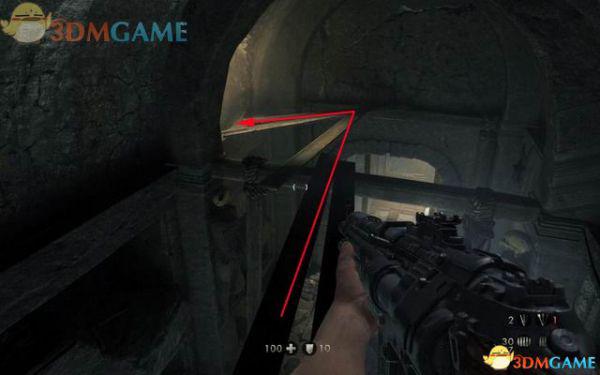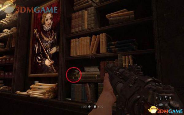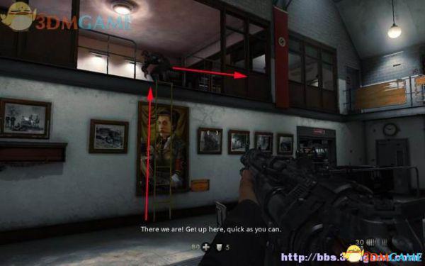 在大厅经过一场激烈的枪战,斯利会在如图的女纳粹画像这里放下一道竖梯,由它爬至二层平台。