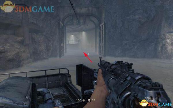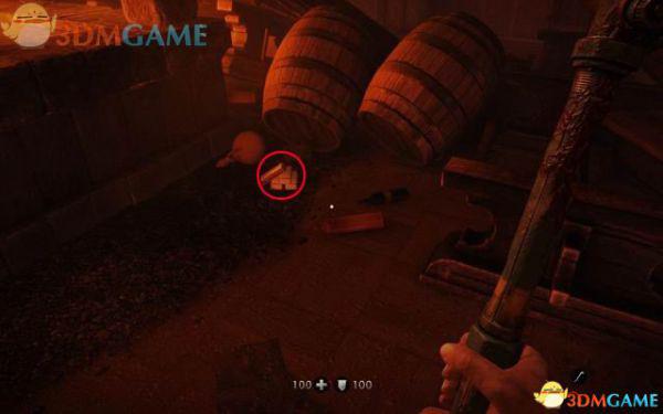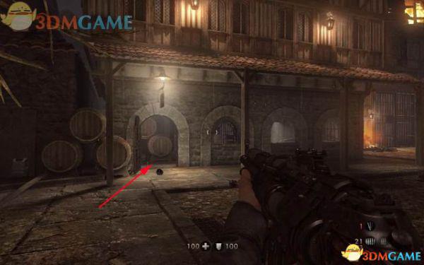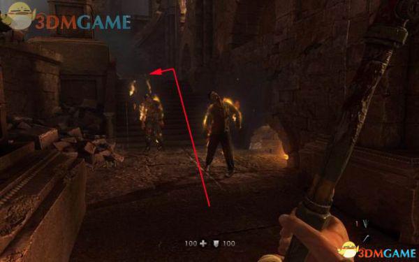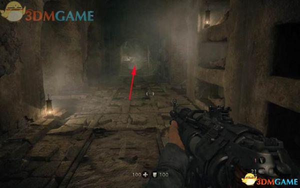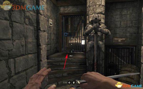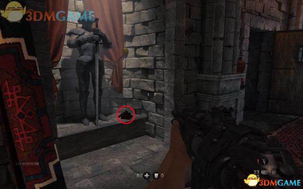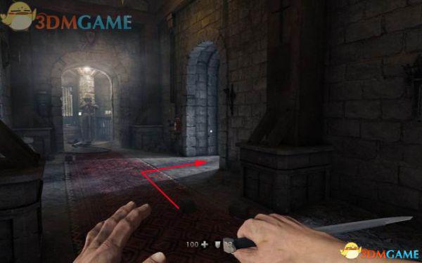 回到酒窖区域,杀掉两名指挥官后,进入如图所示的通道,在武士雕像的右侧。