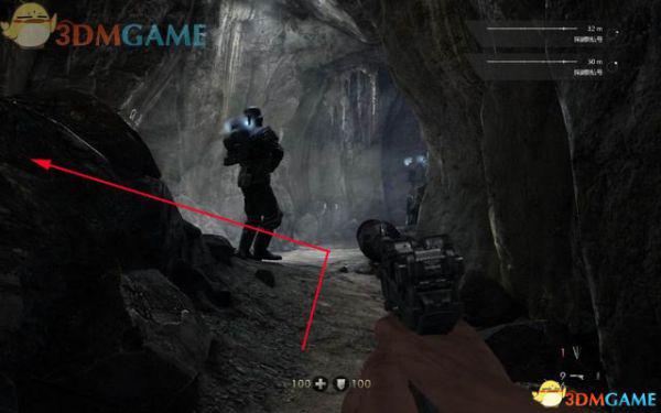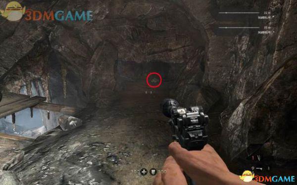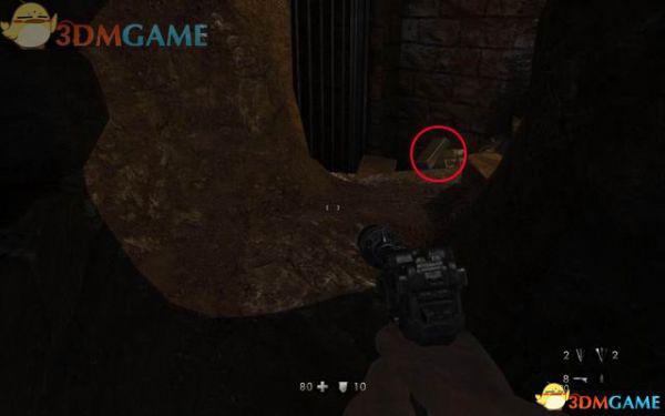 回到矿洞的主通道继续清理德兵,在如图位置有岔路,右手边是破损的铁丝网,通往一处水洞。