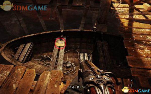 落到一条有几只机器人守卫的弧形走廊,使用两截钢管沿左侧的墙壁爬上木桥。