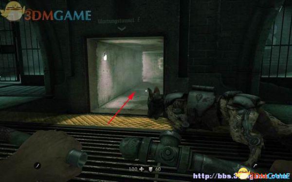 接下来要击杀两只装甲狗,进到标有E字母的通道里。
