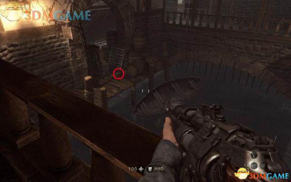越过护栏朝右下方的栈桥看,在木桶前找到黄金收藏物#51。