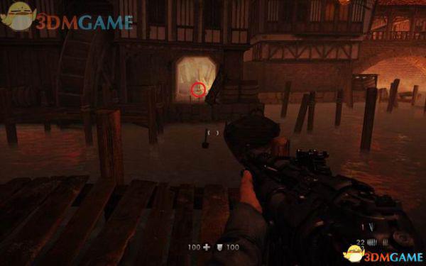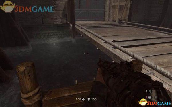 开始关卡,由码头打开闸门后,游过闸门,再爬过山道由前面的墙壁攀入堡垒内部。