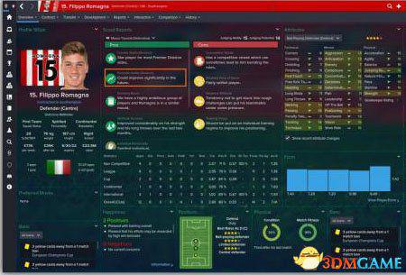 这个小朋友是fm15中我见到过数据分配最完美的Ball-Playin Defender了,开档在尤文会自动挂牌,我这个圣徒的档里第一年从尤文租借,合同内加了12m磅的买断条款(这里个人感觉是给的多了,其他档内我尝试过10m以内的),现在练到2017年,身体和精神几乎已经成长完美,而且还有很大成长空间(-9PA随的高)。