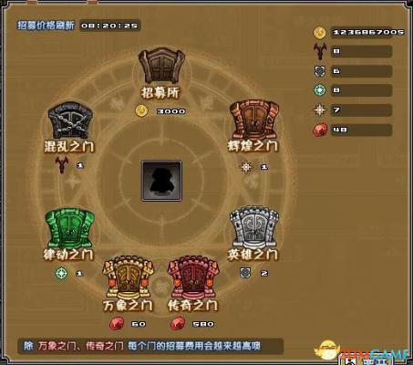 游戏中英雄的主要来源,玩家可通过招募获得各种不同品质的英雄。游戏中招募的种类共有7种:招募所:通过游戏币进行招募,最高可获得蓝色品质的英雄;混乱之门:通过混乱徽记进行招募,可获得所有品质的英雄;辉煌之门:通过辉煌徽记进行招募,可获得所有品质的英雄;律动之门:通过自然徽记进行招募,可获得所有品质的英雄;英雄之门:通过堡垒徽记进行招募,可获得所有品质的英雄;万象之门:通过血钻进行招募,可招募到至少为蓝色品质的英雄;传奇之门:通过血钻进行连续十次招募,可招募到至少一名金色品质的英雄