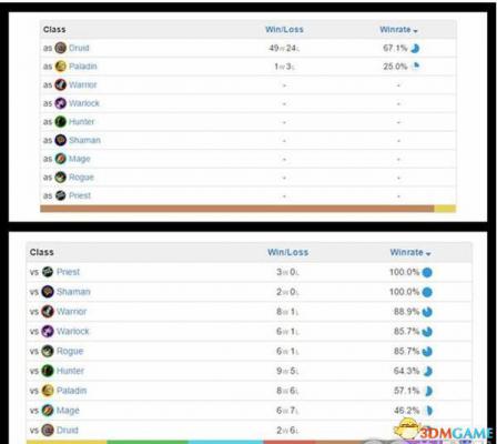 看上去很可怕不是么?胜率低于50%的对局只有德鲁伊镜像战和机械/节奏法:1、德鲁伊镜像战谁起手有成长激活就赢了一半;而对阵机械法或者节奏法时的劣势也是不可避免的,不过其他的对局胜率就都很可观了。