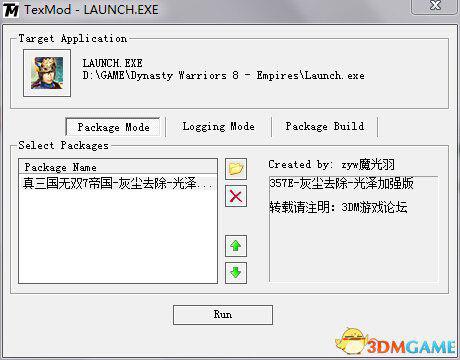 先下载一个软件TEXMOD,用法很简单,选定游戏的启动器,载入TPF文件后按RUN即可