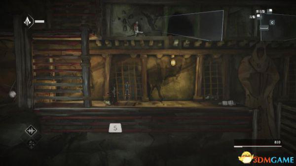 来到一处二层的监牢内,对着连同远处的木梁按W键,就可以去到远方的牢房前。