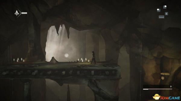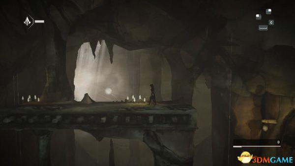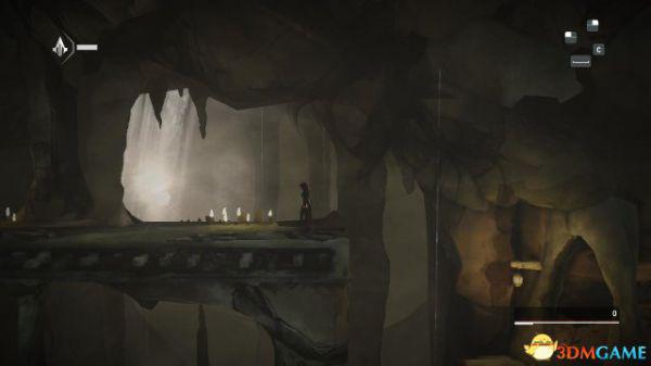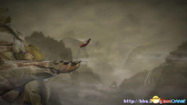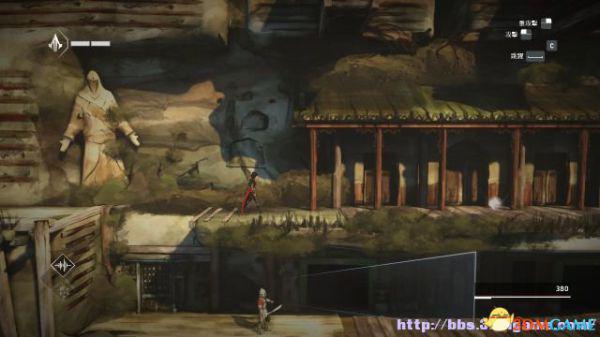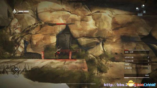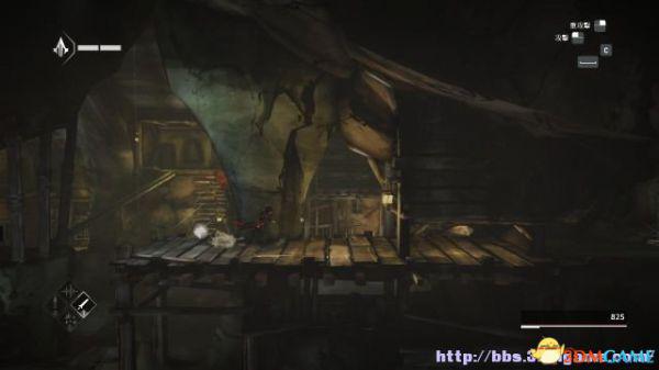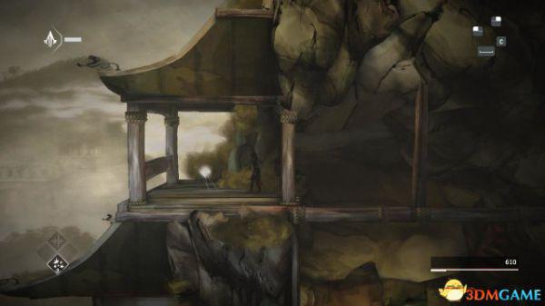 走上前往远方的红色木梁前往远方的洞穴内,在洞穴中跳过一段缝隙进入到亭子内,然后爬上右端的梯子上到上方断裂的长廊,然后往断裂长廊的左端跑去。