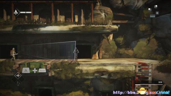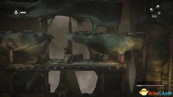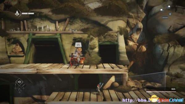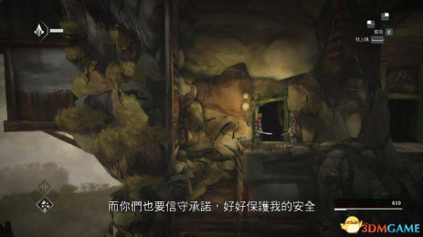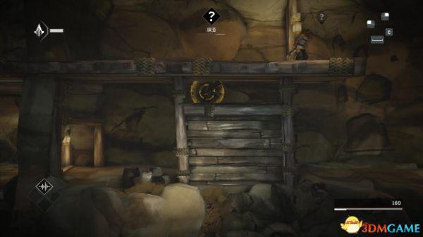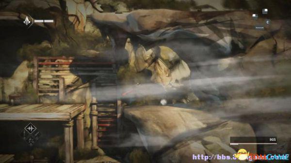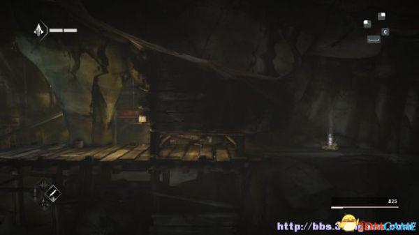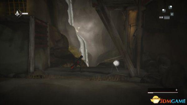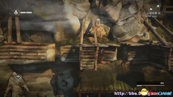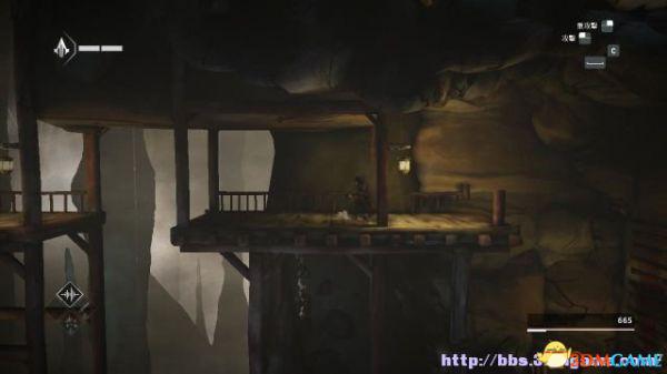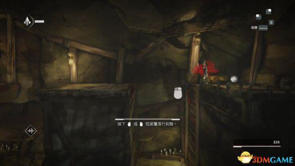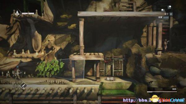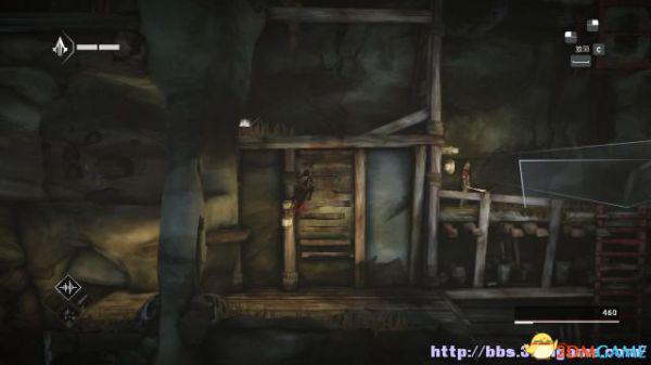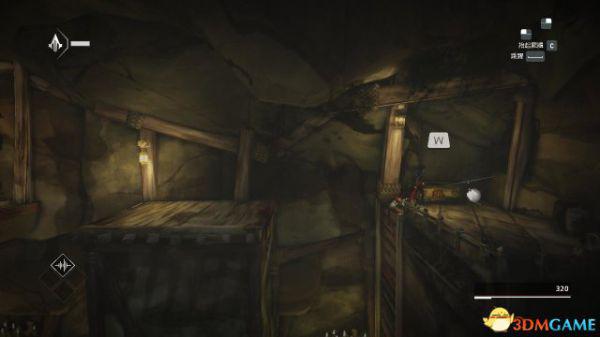 爬上左端的梯子之后,在岩壁表面的木梁右端甩至右侧的木梁,一直沿着岩壁的木梁往右侧移动,最终落到地面以蹲伏姿势通过岩石下方狭隘的缝隙。