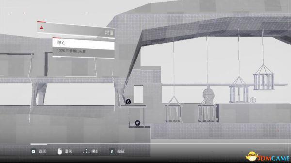 三层监狱在远方,而少芸右侧有四个垂吊的牢笼,先落到三层监狱入口下方的平台捡到一颗ANIMUS碎片(5/6)。