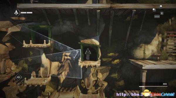 step23.然后跳到托举石像左手的匿藏处内,继而跳到其右手托举的匿藏处,待左侧上中下三层各一名守卫的视线往左侧望去时,跳到上层的匿藏处当中。