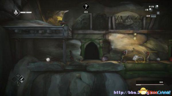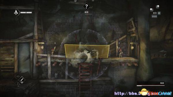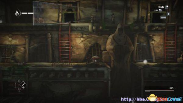 接下来爬上梯子,待二层的士兵往楼梯左侧走去时,按D键+空格键,将少芸甩到二层右侧,然后转动绞盘打开闸门。