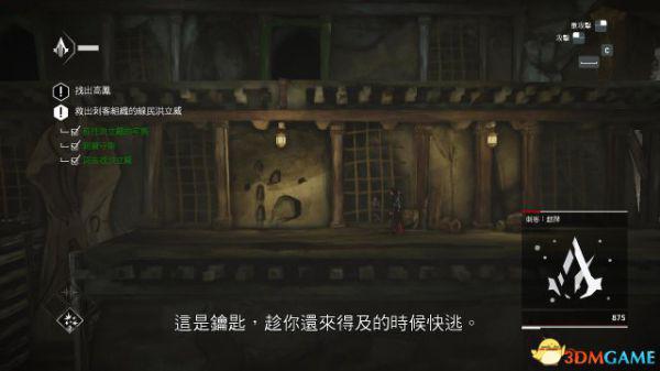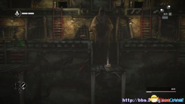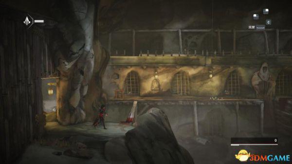 此时往洪立威牢房左侧的坑跳进去,然后依附在坑左边顶部的边缘,然后沿着边缘的木梁绕到左侧,趁这儿的守卫往坑(右)走去时,就在一层左端位置可以拾获本关最后一颗ANIMUS碎片(6/6)。
