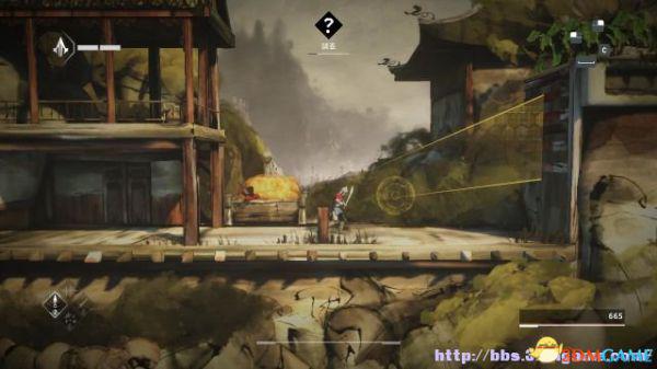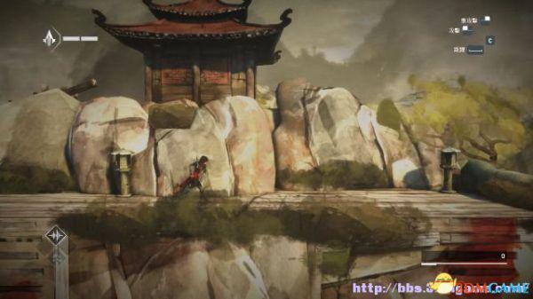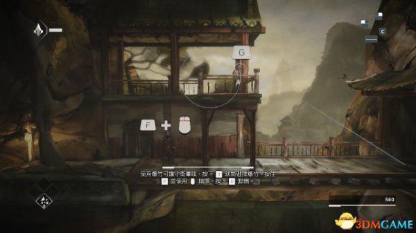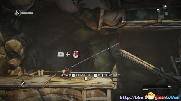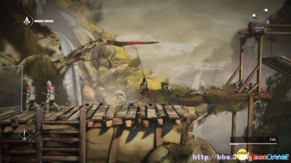 当登上右侧平台是可以发现前方有一座木板桥被一条红绳吊起,此时按下2键可以换出飞刀,按住F键然后移动鼠标,将飞刀的投射轨迹对准红绳的任意一段,然后按G键投出飞刀将红绳切断,那么木板桥就会掉落。
