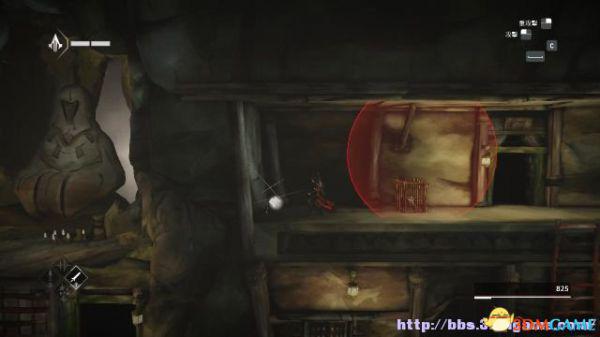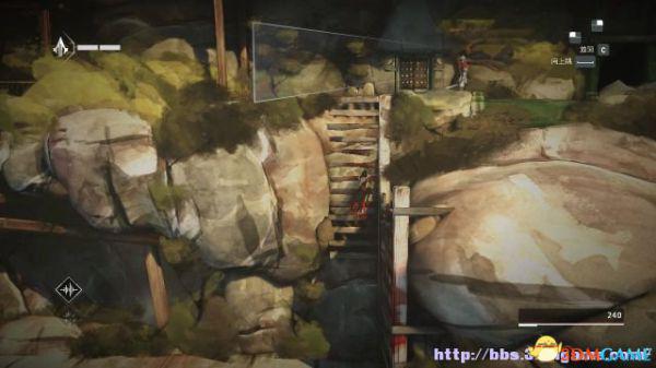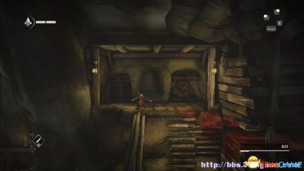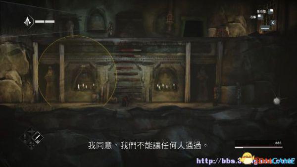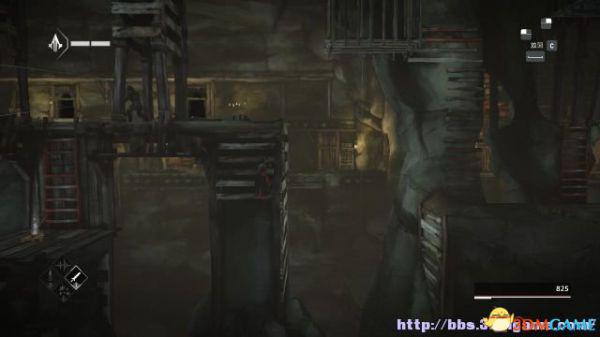 然后落到右下方此区域的底层,爬上梯子,上到上方两名士兵视野交汇处的下方,然后往右上方的绳子投掷一把匕首致使被高高吊起的岩石砸在两名士兵视野交汇处。