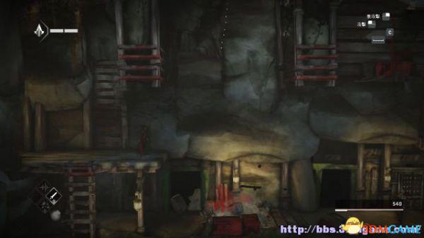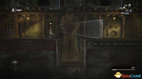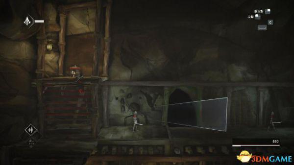 然后快速进入到中部地面边缘的藏身处,当左侧的守卫往左望去时,进入到左侧的洞穴藏身处,然后借助左侧的梯子跳到上层。