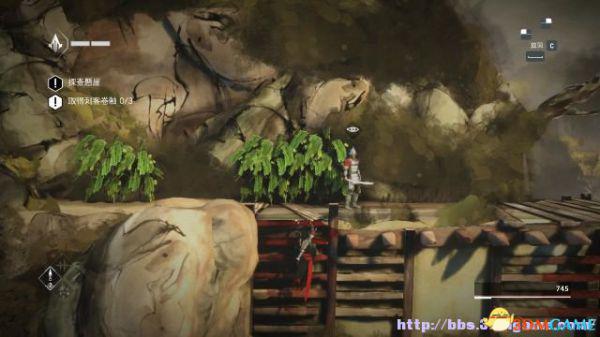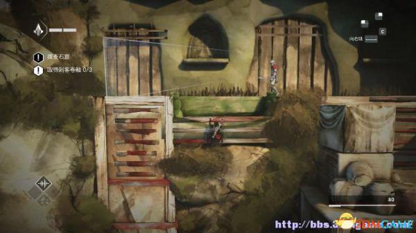 刚到达后,小心左下方有一名会往上视察的士兵,待其转身后跳到左边的爬梯上,跳到左侧的平台的边缘横梁上,沿着边缘往左侧移动,在一个凹陷处会发现第二份刺客卷轴(2/3次要目标)。